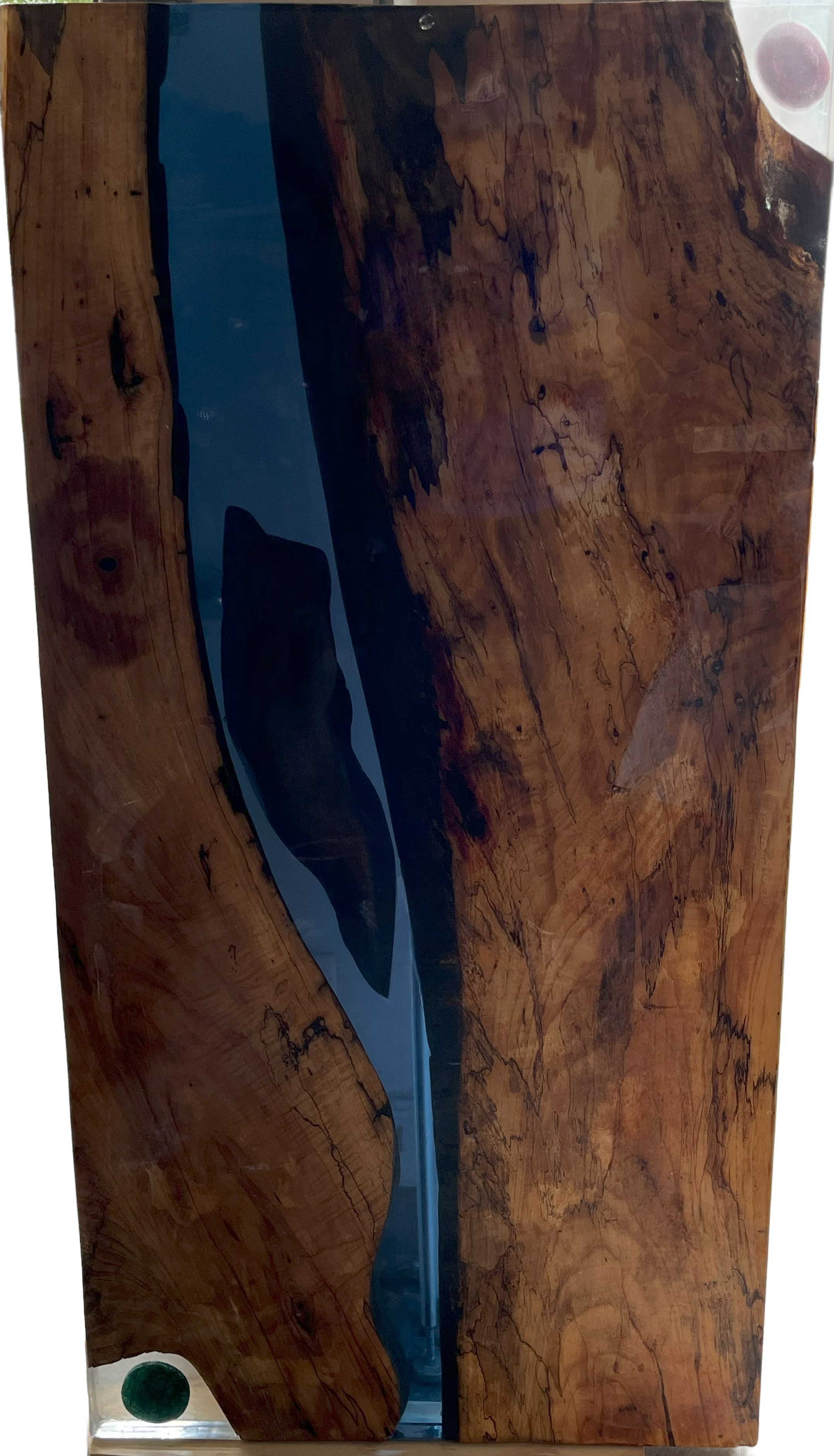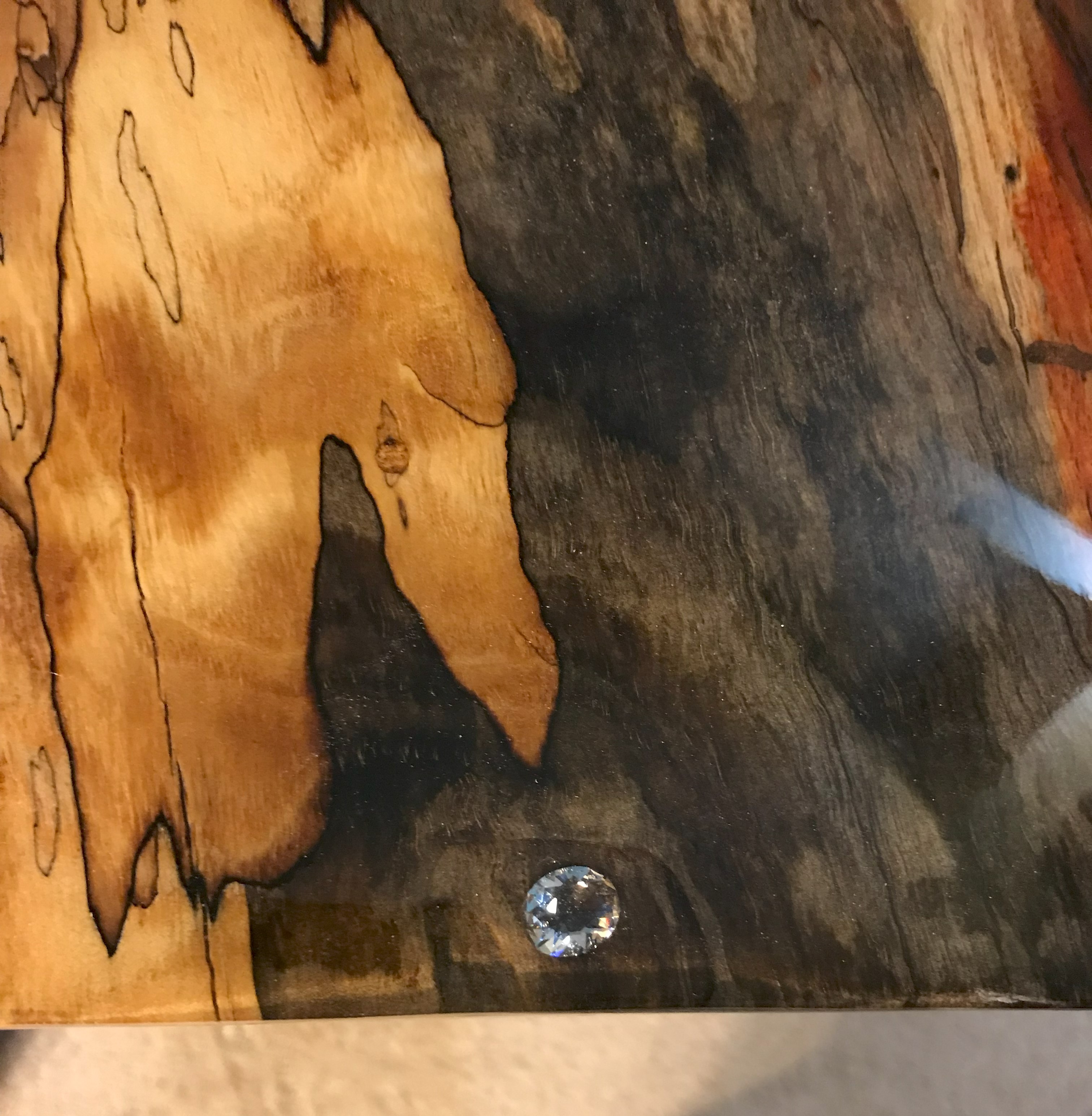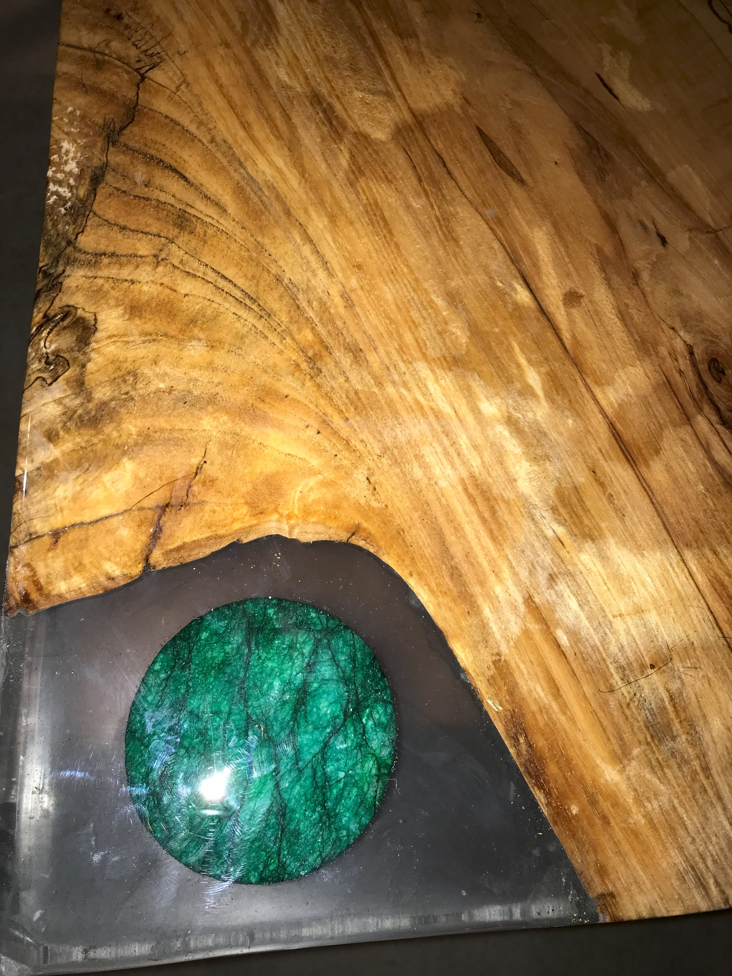 This jewel endowed pecan desk is one of a kind. It boasts a a very rare red marbling along with a 1,355 ct Emerald, 1,310 ct Ruby, 12 ct Sapphire and a 6 ct Moissonite. Dimensions are 56″ by 28″ by 2.5″