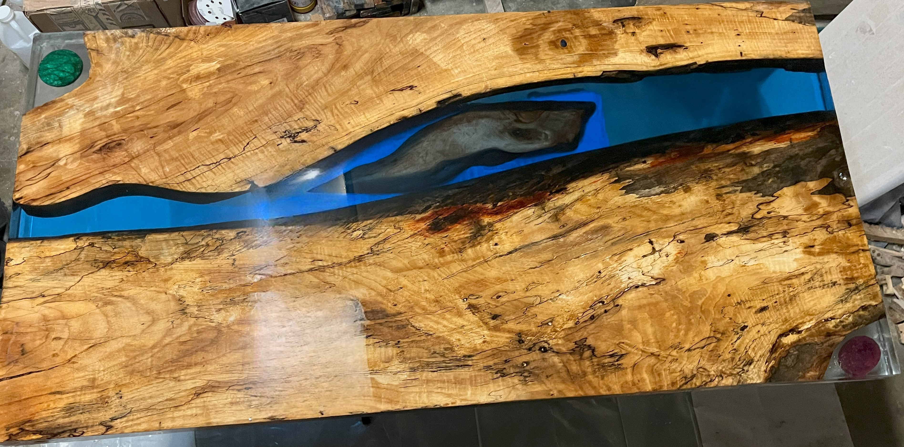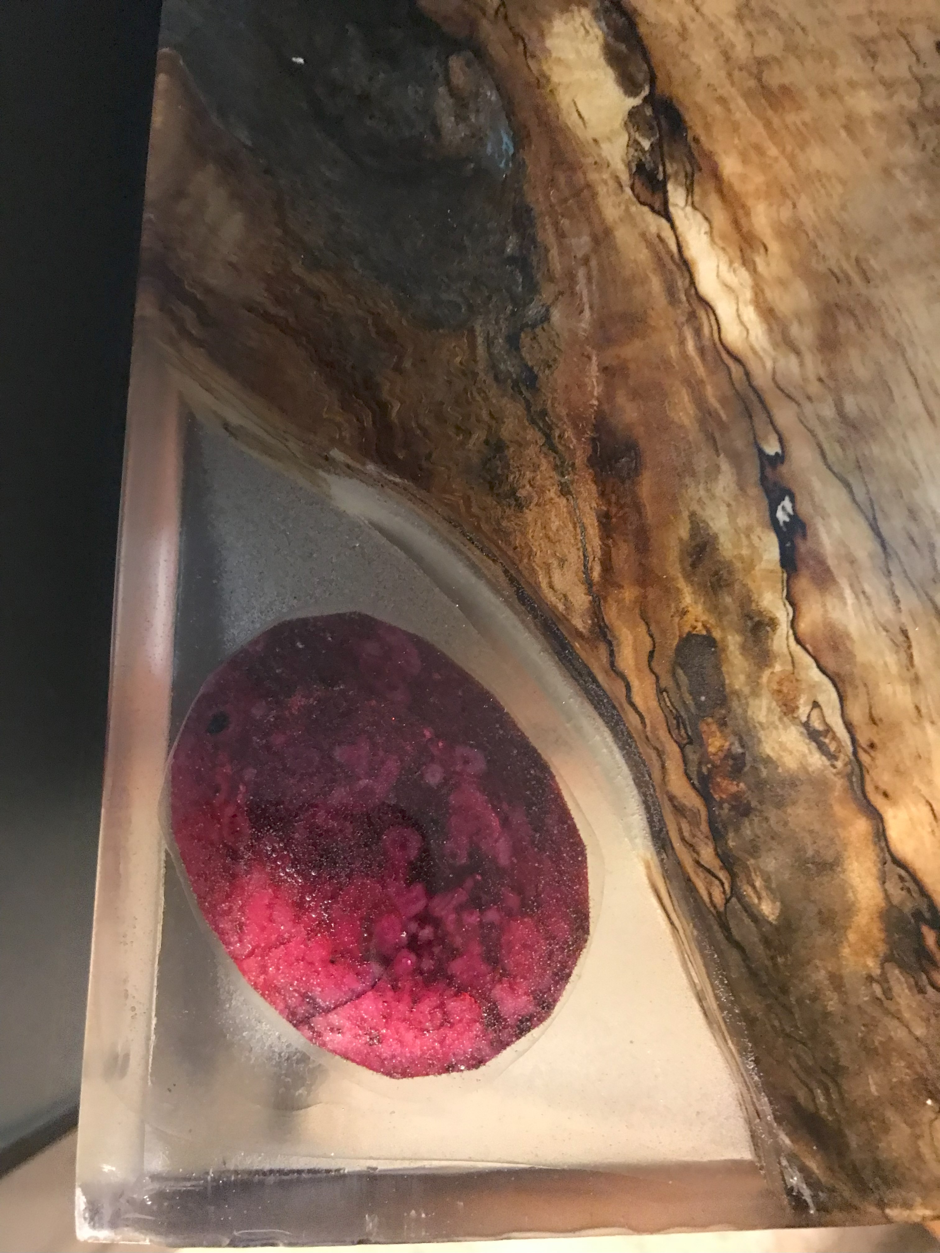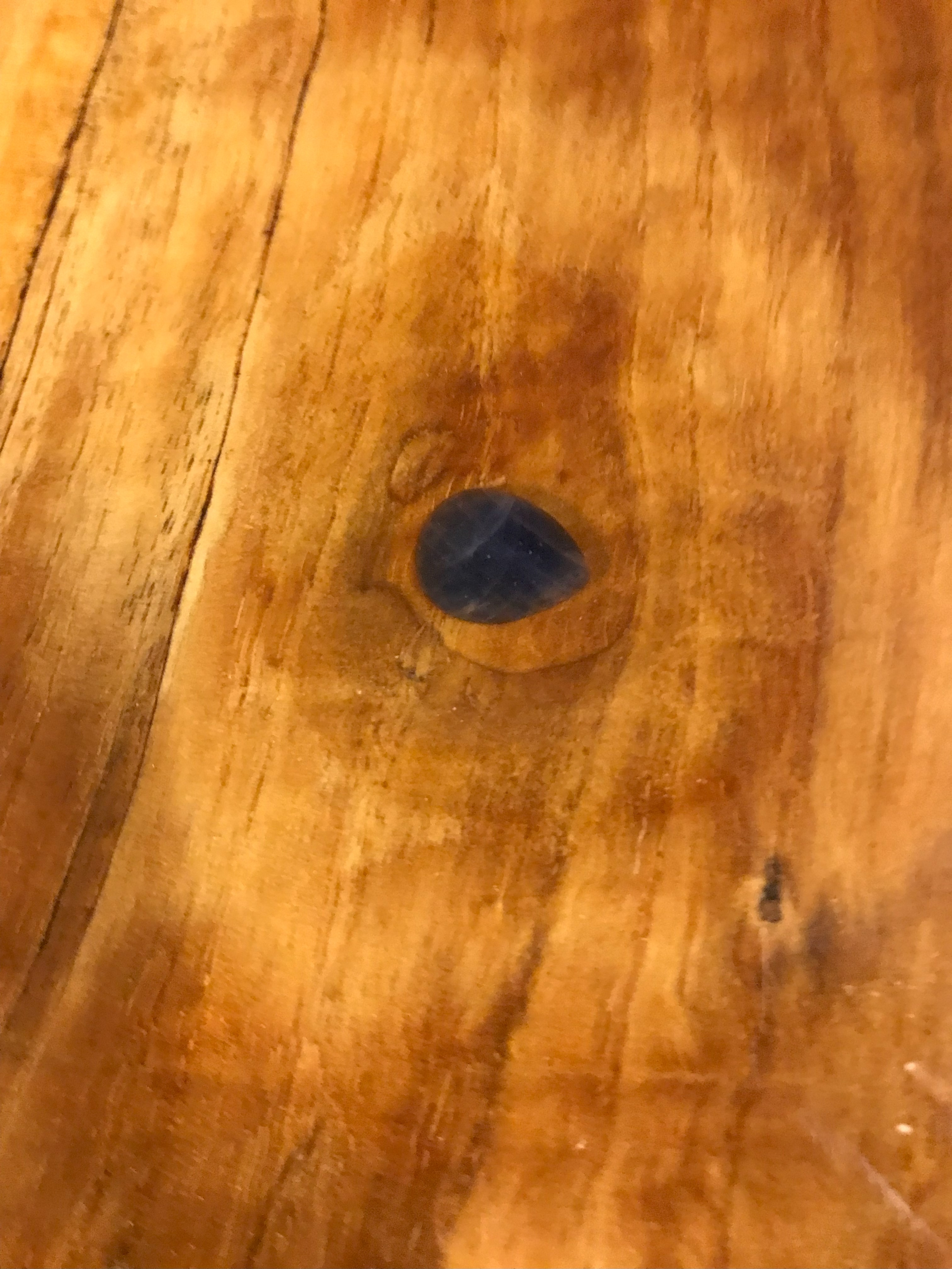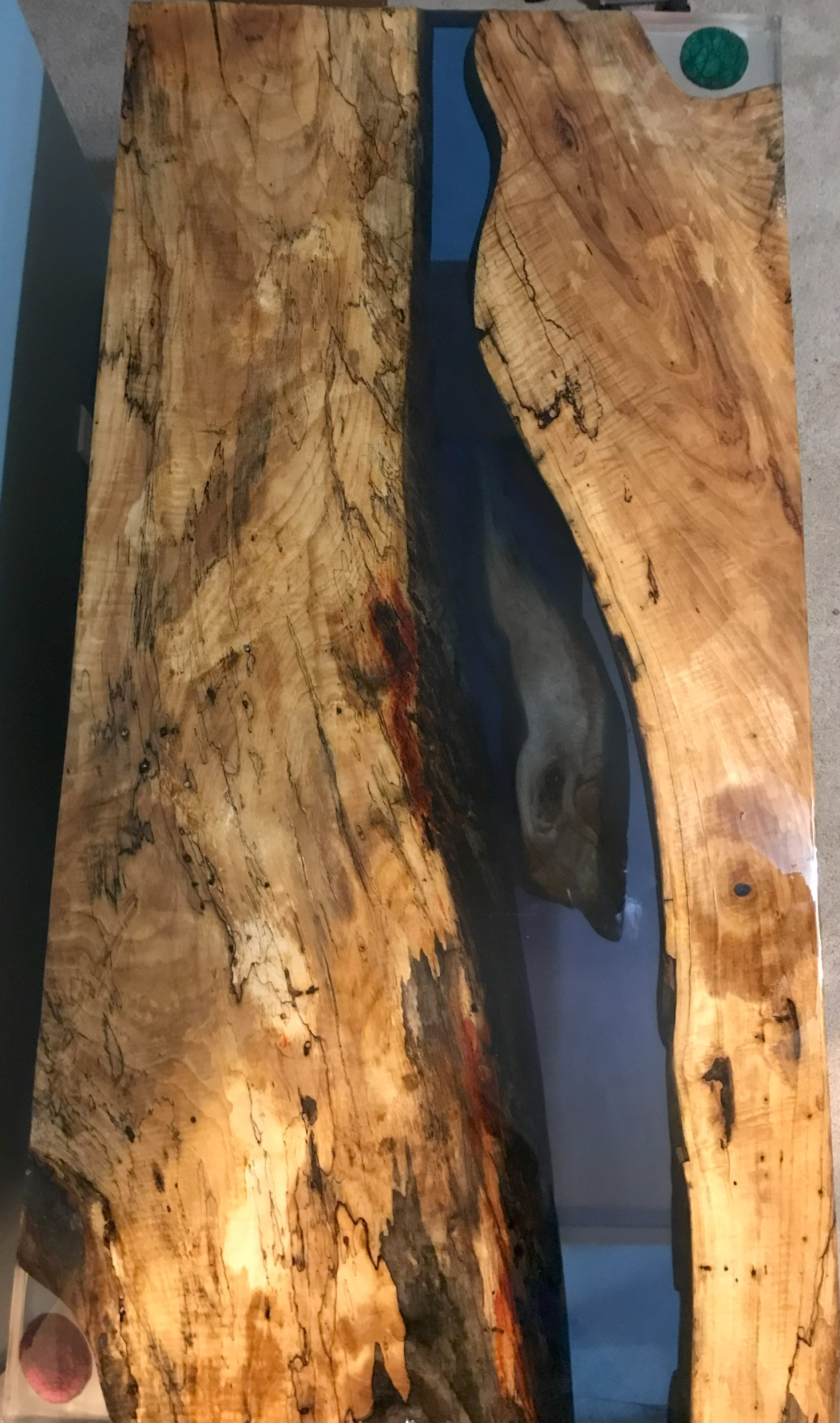This jewel endowed pecan desk is one of a kind. It boasts a a very rare red marbling along with a 1,355 ct Emerald, 1,310 ct Ruby, 12 ct Sapphire and a 6 ct Moissonite. Dimensions are 56″ by 28″ by 2.5″