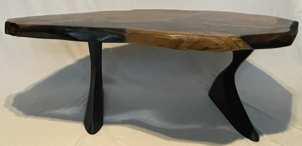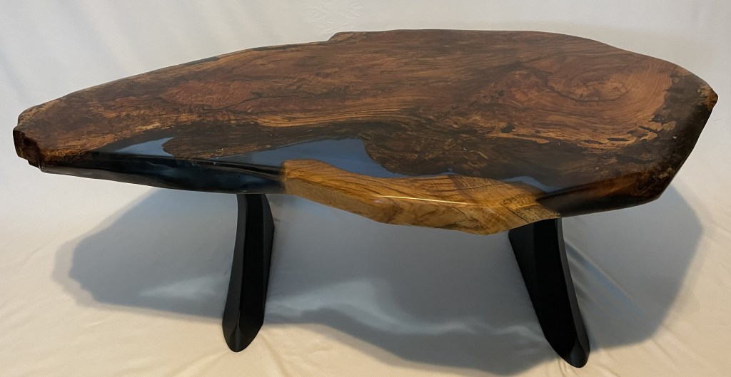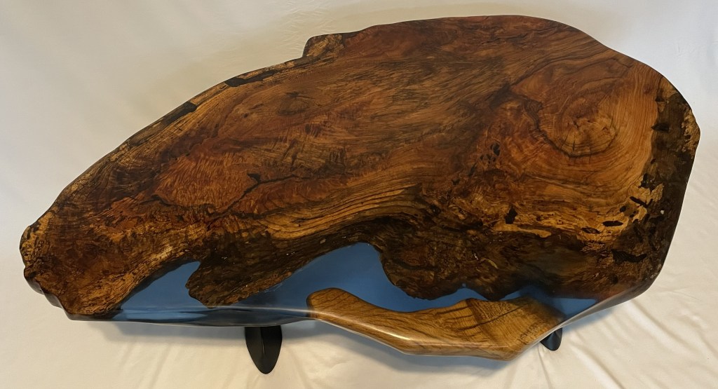 This one of kind marbled Red Oak table measures 53 1/2 inches long, 32 inches at its widest (18 inches near the end) and 2 inches thick.