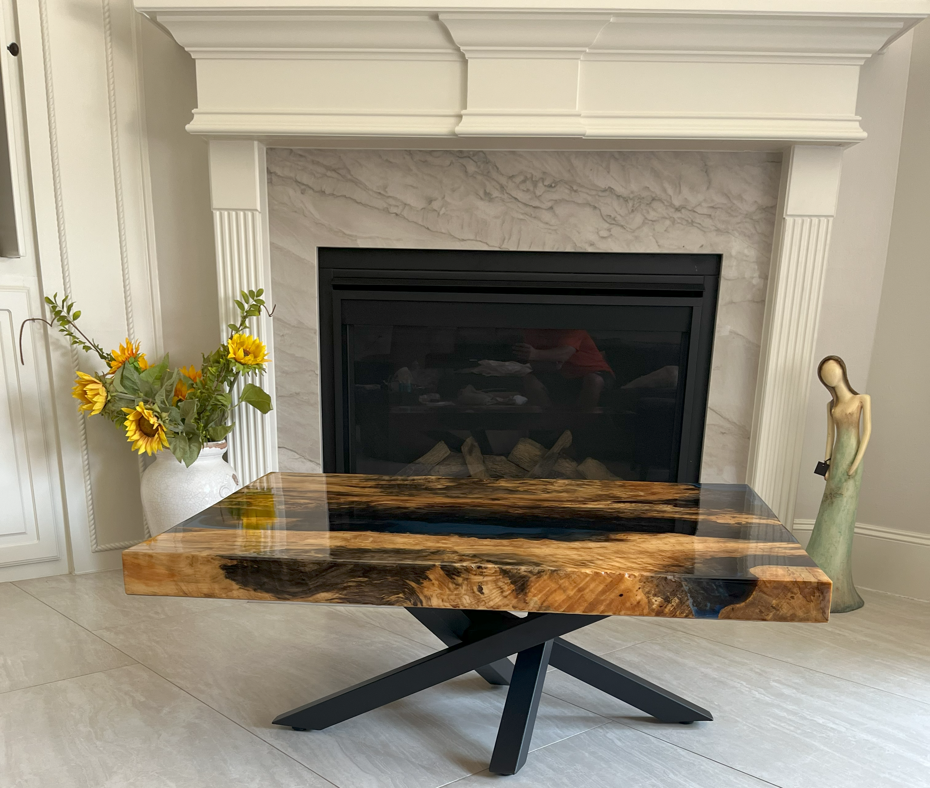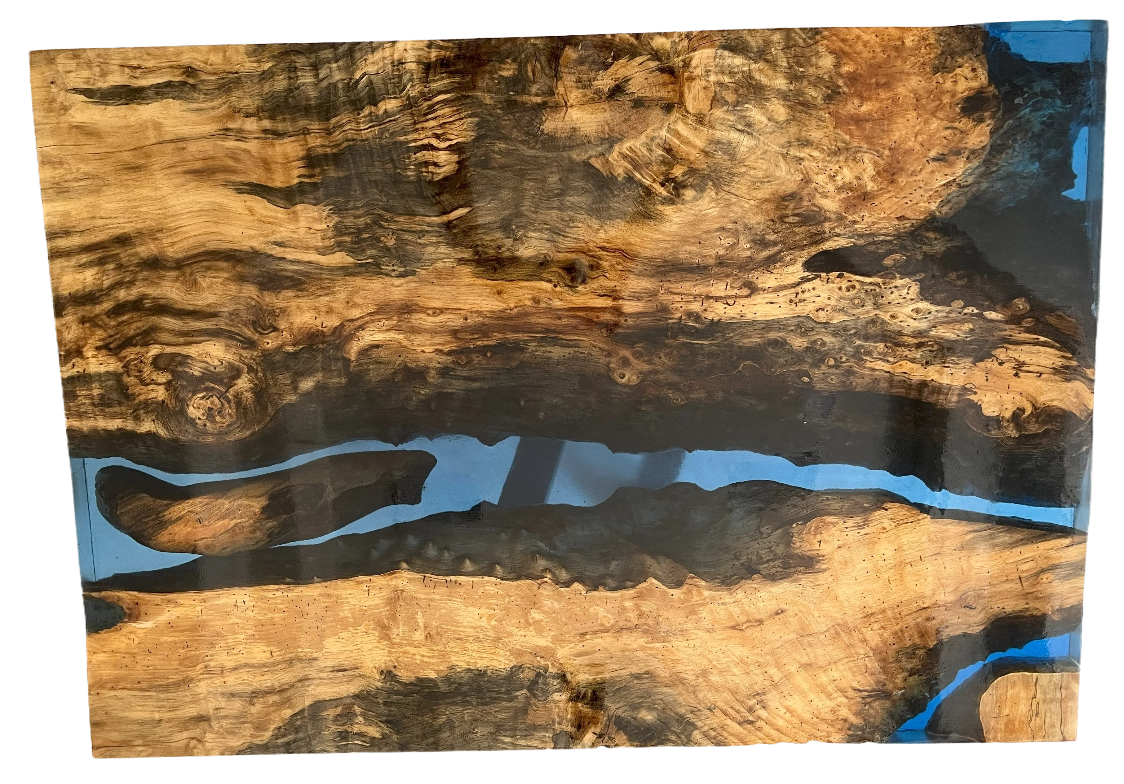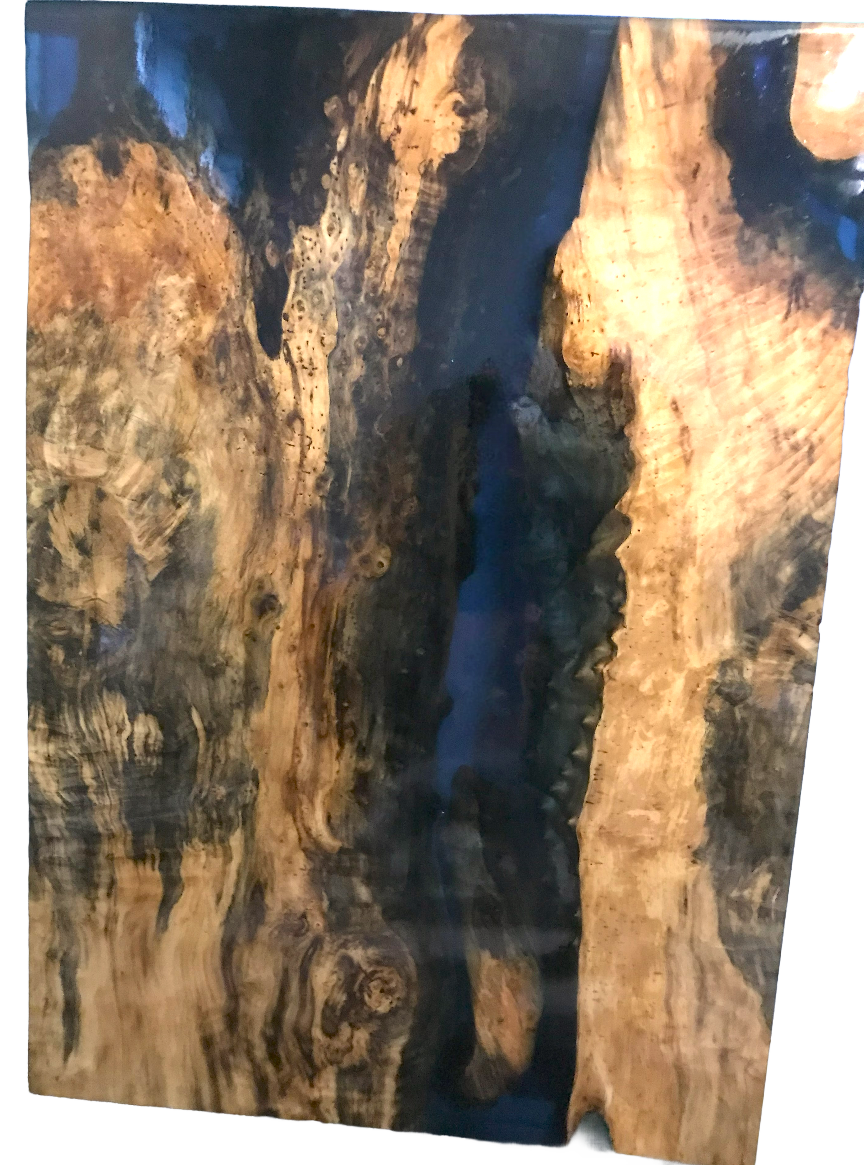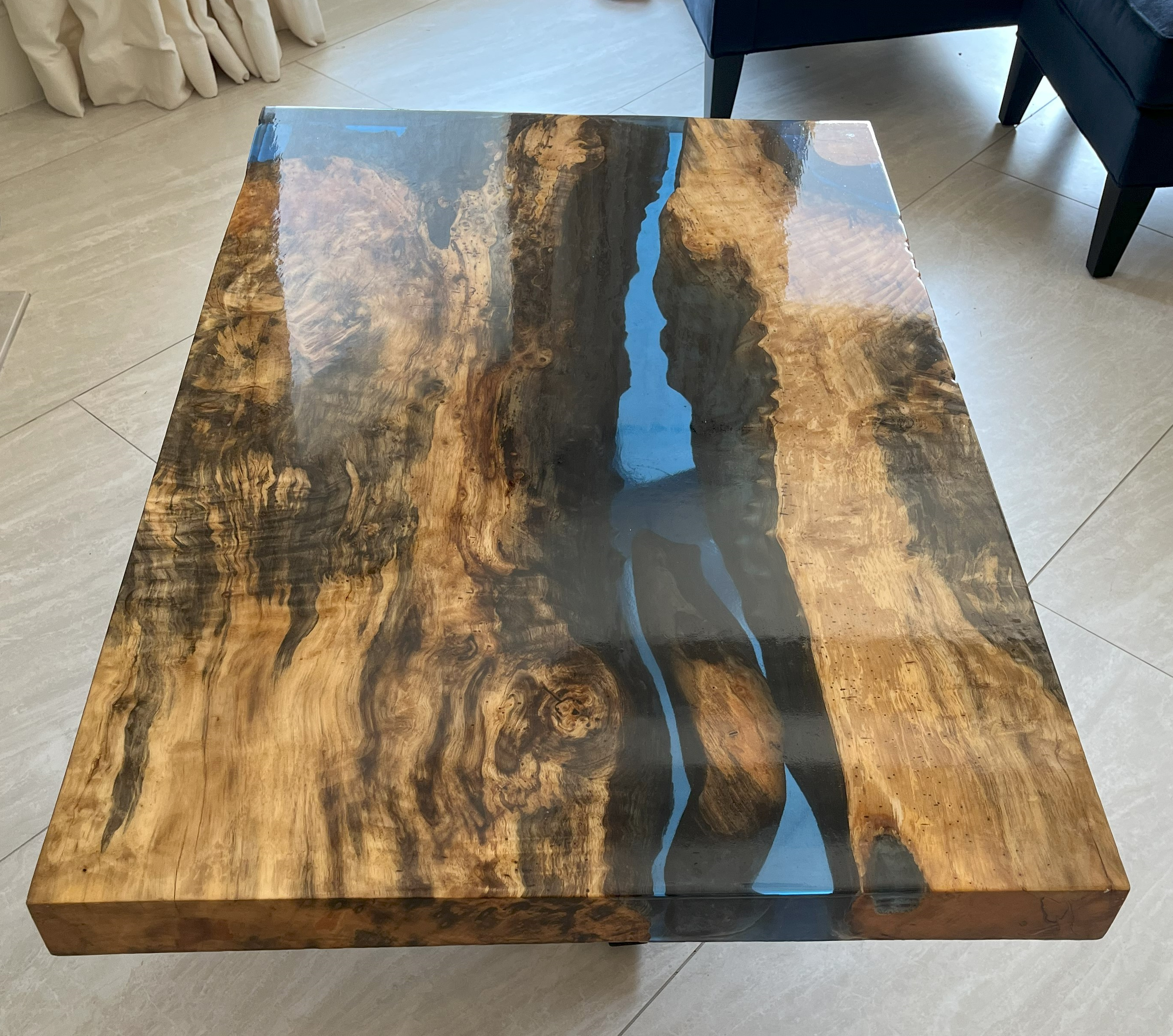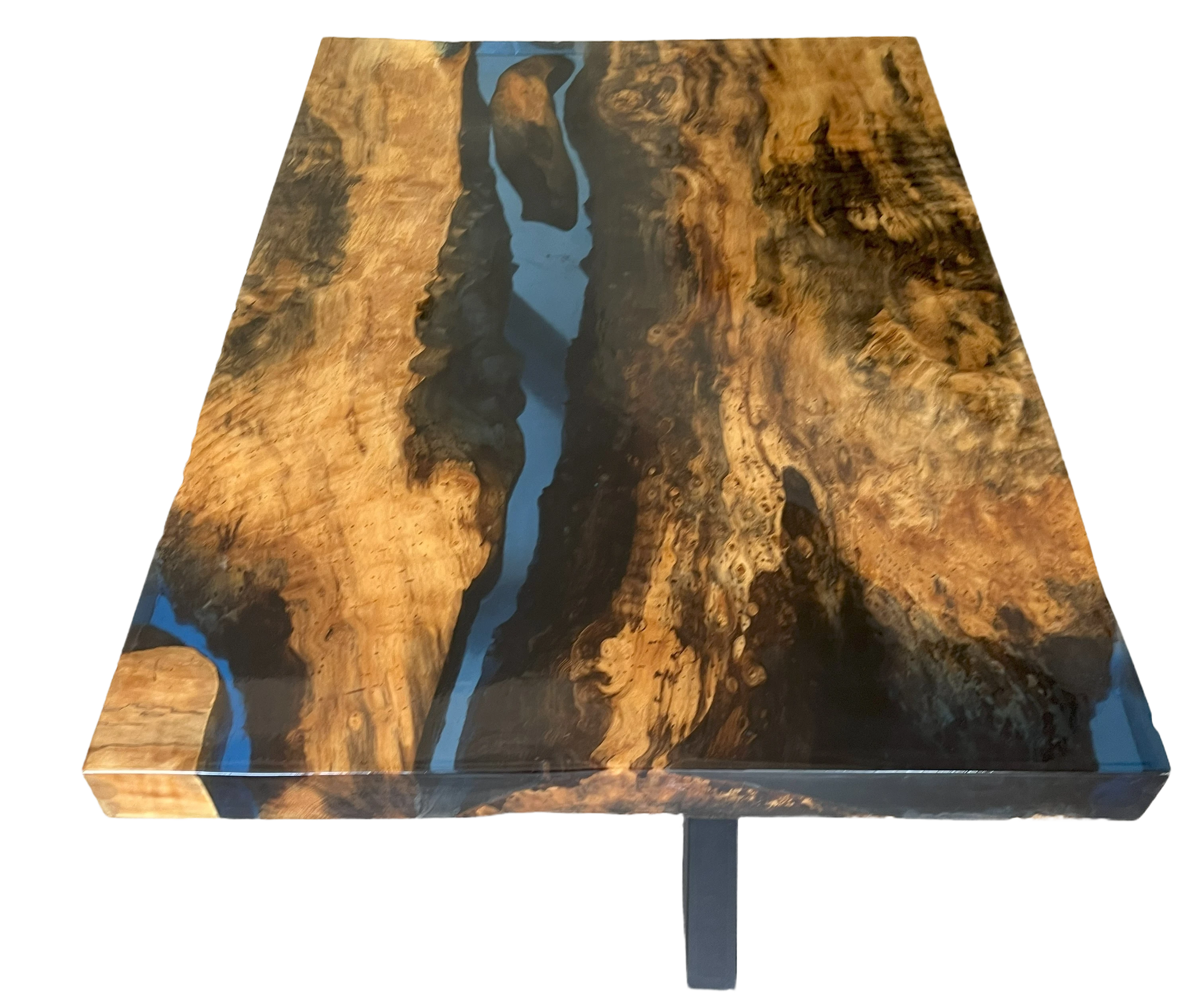 This magnificently marbled Sweet Gum table sits on a unique spider leg base. Dimensions are 41.5″ by 29″ by 2.5″.